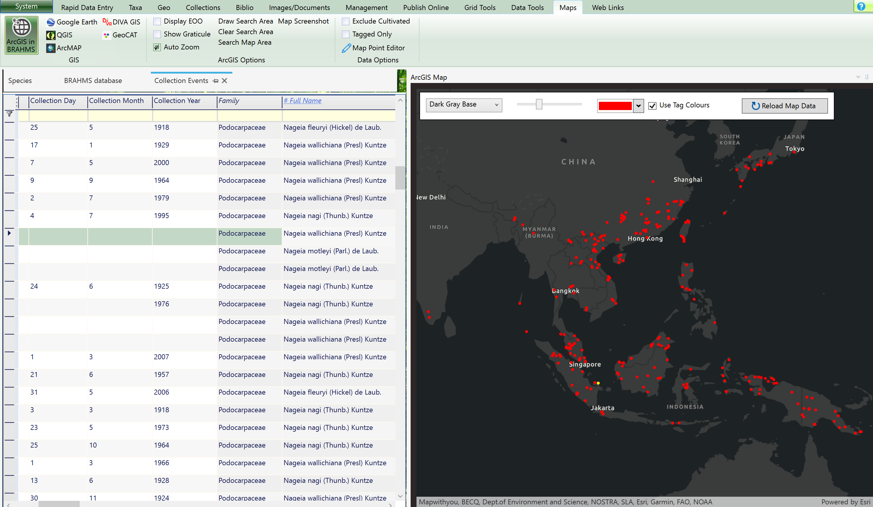 For example, the BRAHMS database has an in-built ARCGIS feature (a mapping solution) that make it easy to map botanical collections